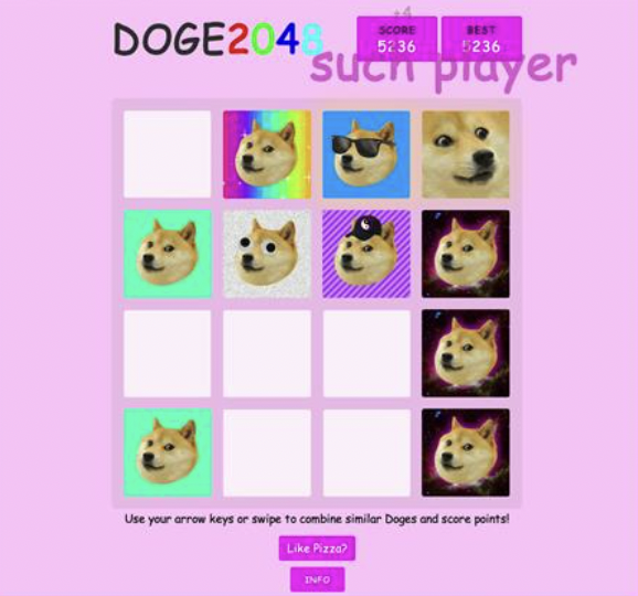 The superior version of the game 2048, called "Doge 2048" came out in 2014. This game has no numbers, only different doge memes in place of numbers. When you score points, little doge language encouragements pop off the screen at you.